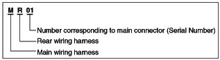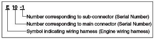 A connector identification symbol consists of a wiring harness location classification symbol corresponding to a wiring harness location and number corresponding to the connector.