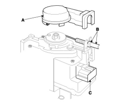 1. Loosen the locknuts(A) and disconnect the actuator cable (B) from the throttle linkage(C).