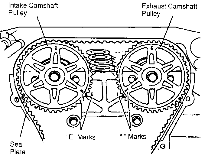 11. Check that the "E" mark on the intake camshaft pulley is aligned with the "E" mark on the seal plate and the "I" mark on the exhaust camshaft pulley is aligned with the "I" mark on the seal plate.