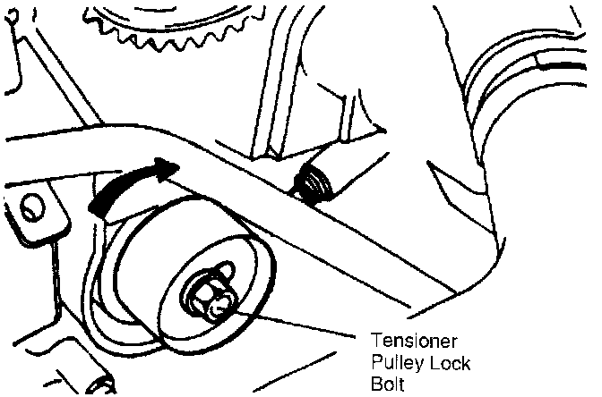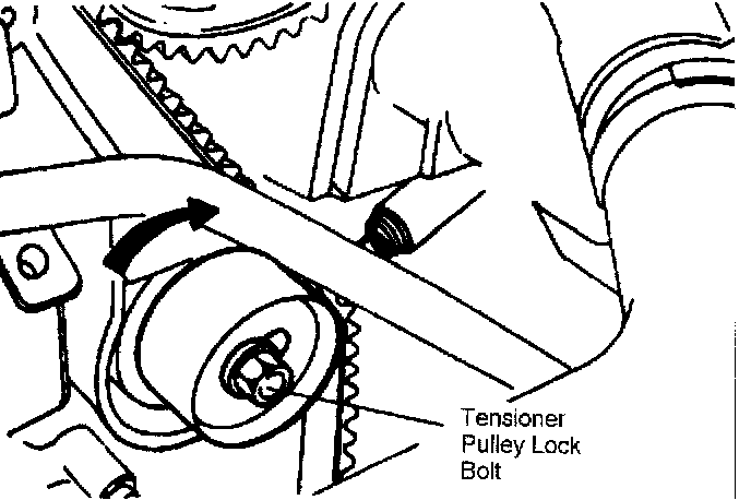 8. Loosen the tensioner pulley lock bolt and allow the tensioner spring to apply tension to the timing belt.
