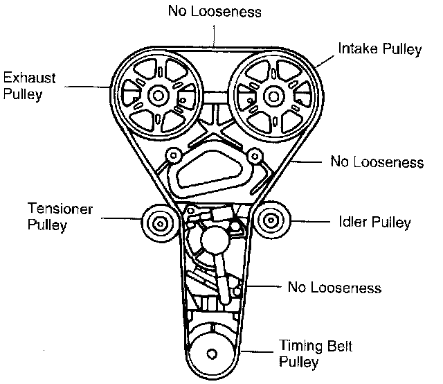 6. Check that there is no looseness in the belt between the idler pulley and the exhaust camshaft pulley or between the intake and exhaust camshaft pulleys.