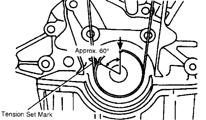 13. Rotate the crankshaft 1-5/6 turns (clockwise only) and align the timing belt pulley timing mark with the tension set mark, as shown in the illustration.