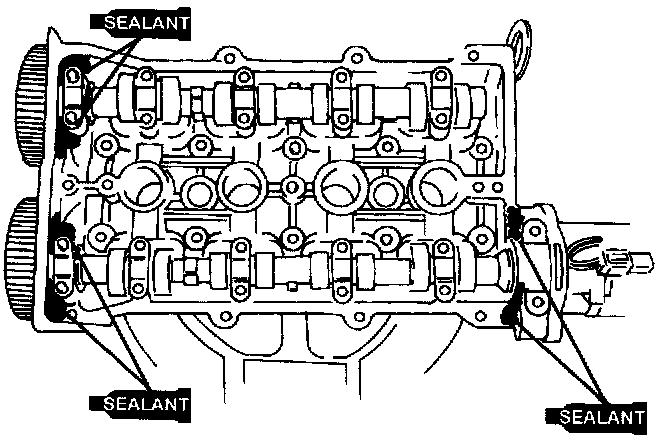17. Apply silicone sealer to the areas next to the front camshaft journals and the distributor mounting cap.