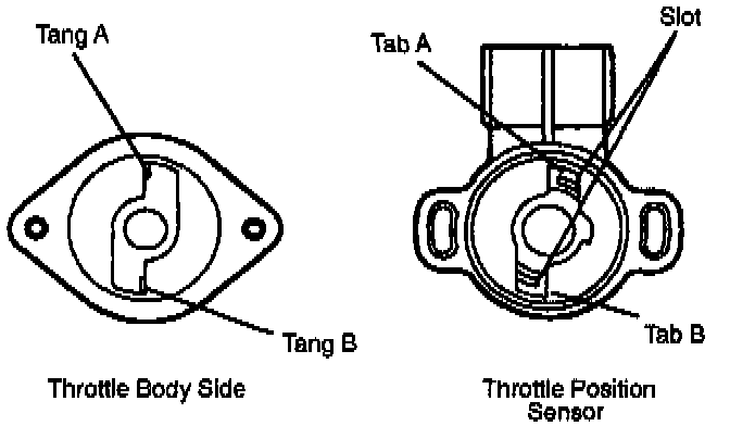 NOTICE: Tangs on The throttle body mate with the tab on the throttle position sensor on the edge of the tab without a slot.