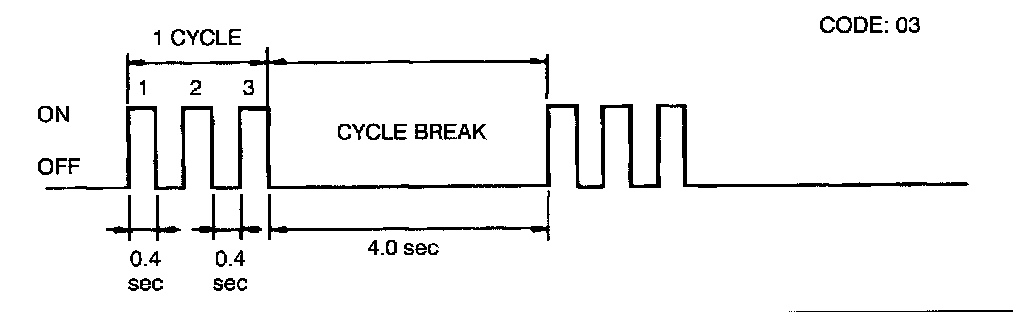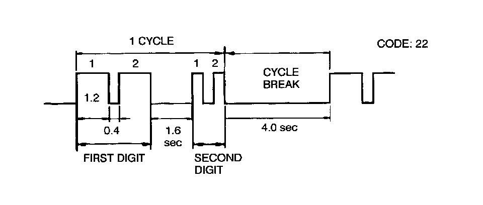 3. first digit of code (tens position). The digit in the tens position of the code is determined by the number of times the lamp is on for 1.2 seconds(during one cycle). The lamp remains off for 1.6 seconds between the long and short flashes.
