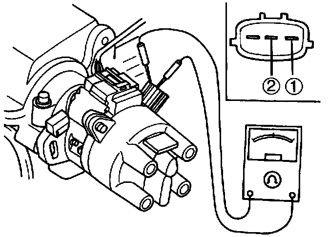 2. Using an ohmmeter, check resistance of primary coil at connector terminals 1 and 2 on the distributor.