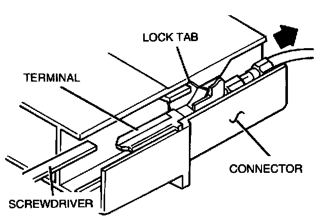 Insert a push-tool, or thin piece of metal such as a small screwdriver, from the terminal side of the connector, and then with the locking tabs pressed down, pull the terminal out from the rear side of the connector.