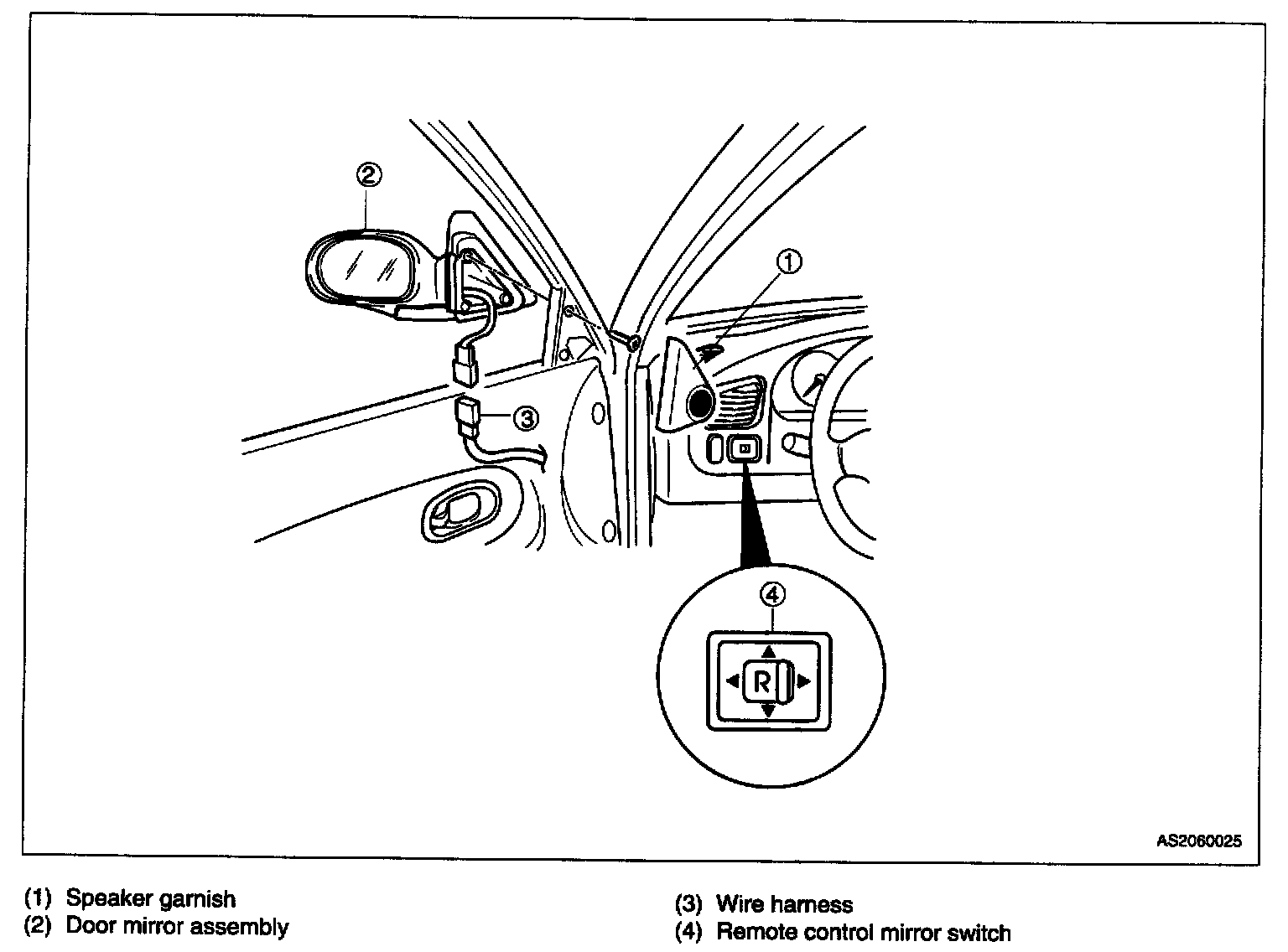 The position of each outside rear view mirror is controlled by two motors. These motors are polarity sensing, or reversible, and are located inside each housing, behind the mirror. One motor tilts the mirror either left or right, and the other motor tilts it either up or down. Power to the motors and their polarity is controlled with switches located in the power mirror controller. The switches that control the direction of mirror tilt are located behind the control ring on the face of the controller. Located in the center of this control ring is a toggle switch that directs the controller's output to either the drivers (L) mirror or passenger's (R) mirror.