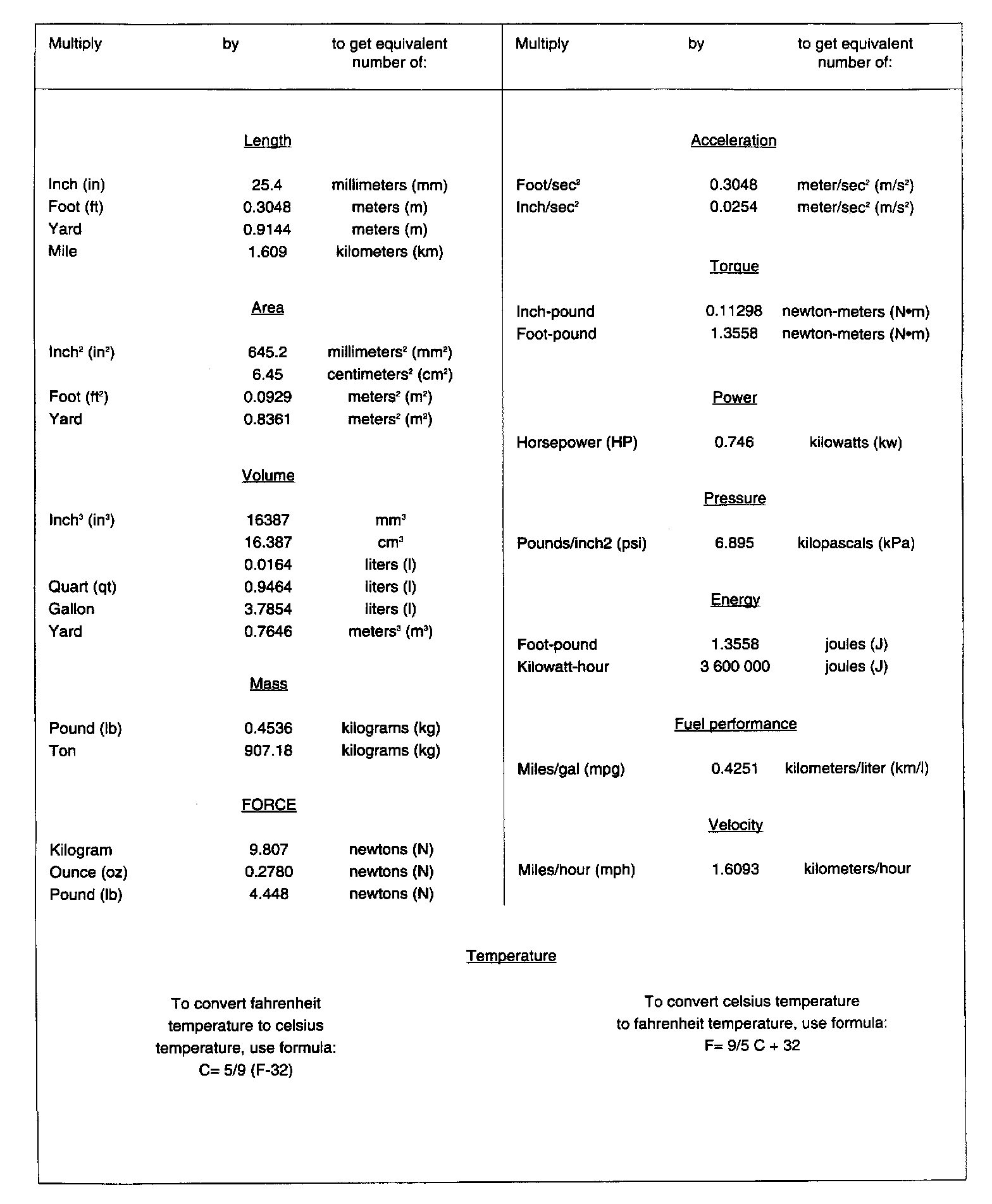 English/Metric Conversion Table