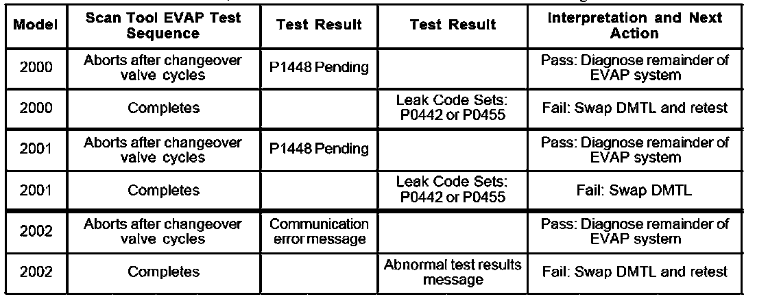 When testing evap. leaks on DM-TL (Diagnostic Module-Tank Leakage) systems, the hardest part may be determining if the DM-TL itself is leaking or another part of the system. After performing a visual inspection and running an evaporative leakage test with the Hi-Scan Pro, if a small or large leak code resets you may want to test the DM-TL by itself. The best way to check the DM-TL is to isolate it from the rest of the system by plugging the hose from the DM-TL at the charcoal canister, then clear codes and run another test. See the following for test results.