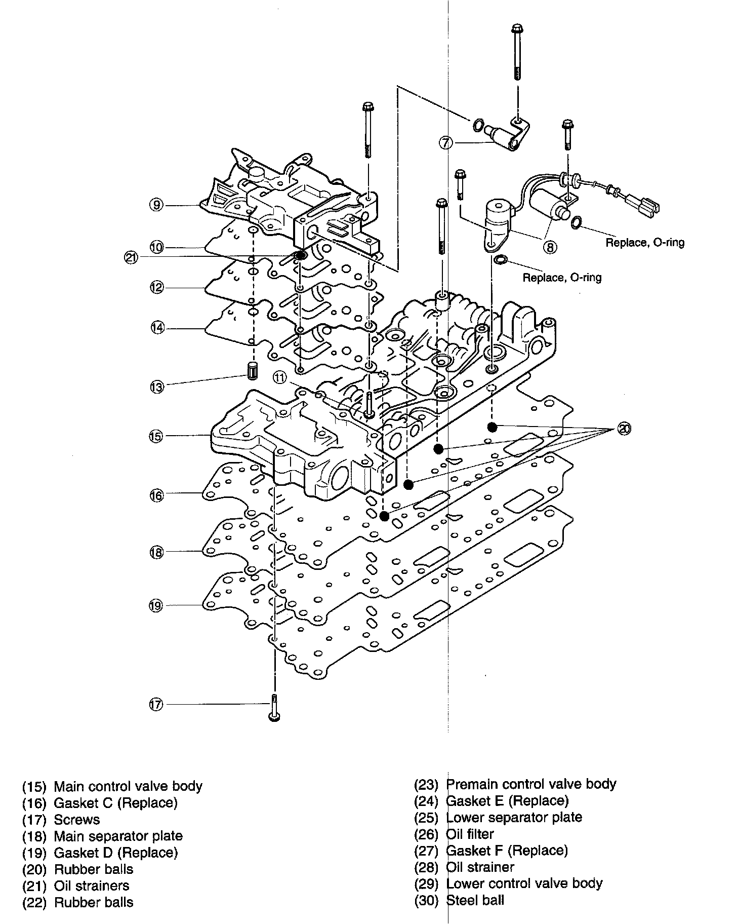 5. Install two rubber balls and oil strainers into their proper positions in premain control valve body. (Refer to Rubber ball and oil strainer installation positions diagram)