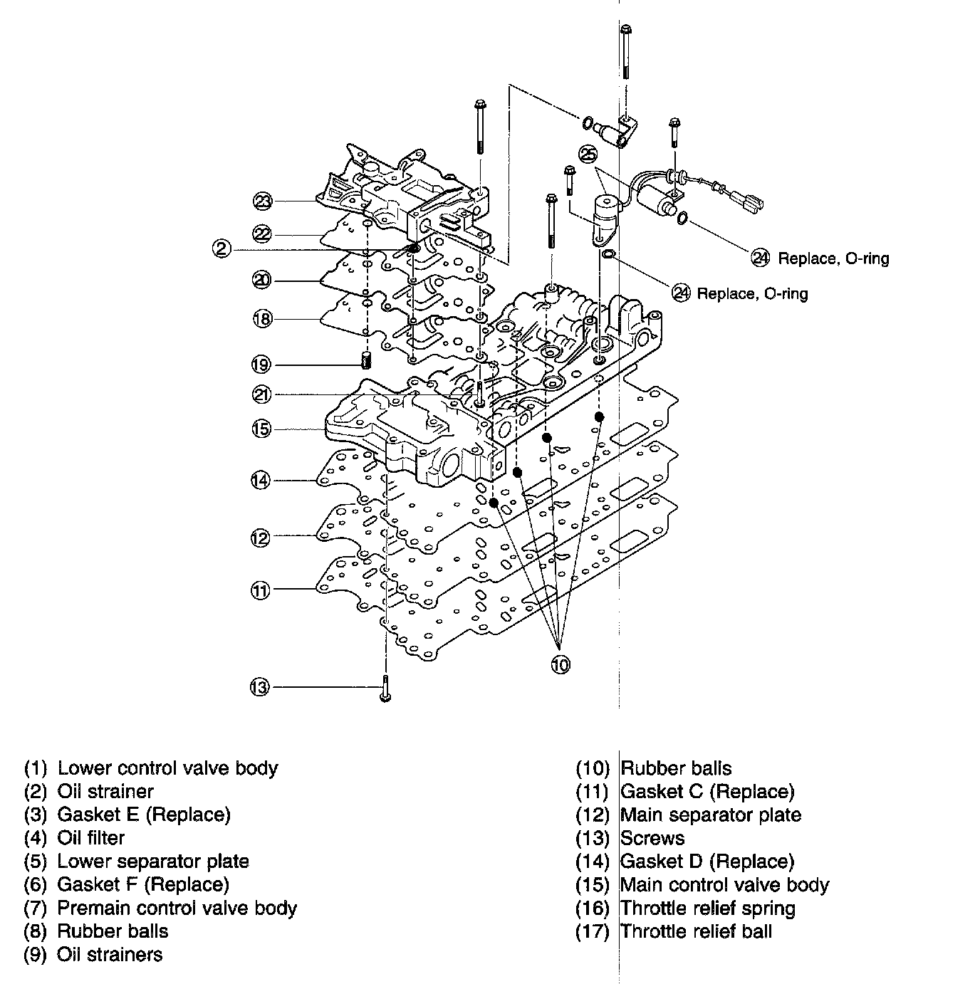 13. Remove oil strainer and two rubber balls from p remain control valve body.