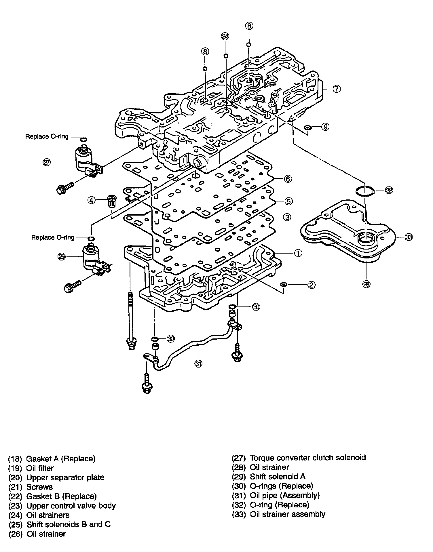 20. Install shift solenoid A and oil strainer onto upper valve body.