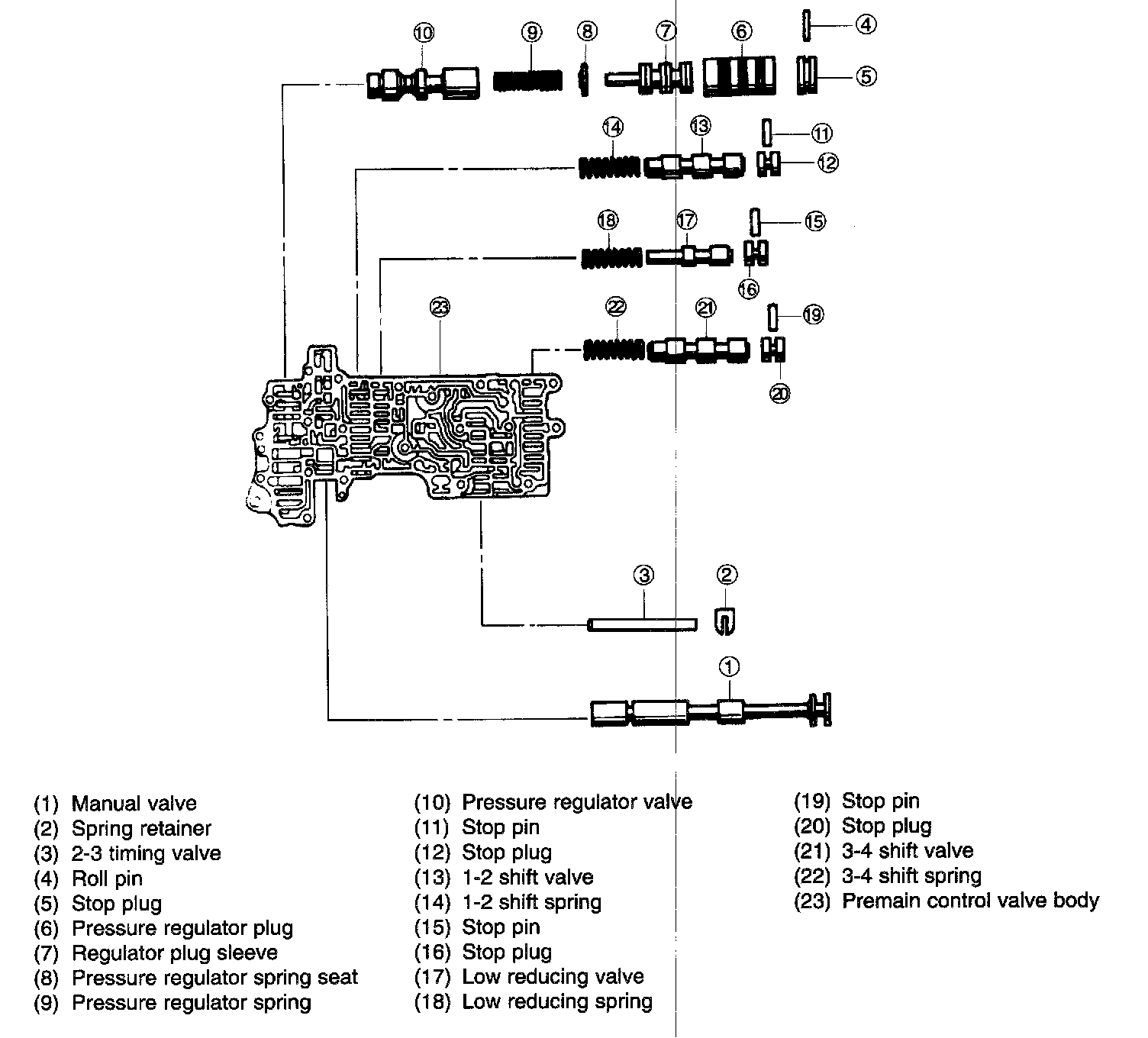 2. Insert 2-3 shift spring, 2-3 shift valve and plug. Secure them with stop pin.