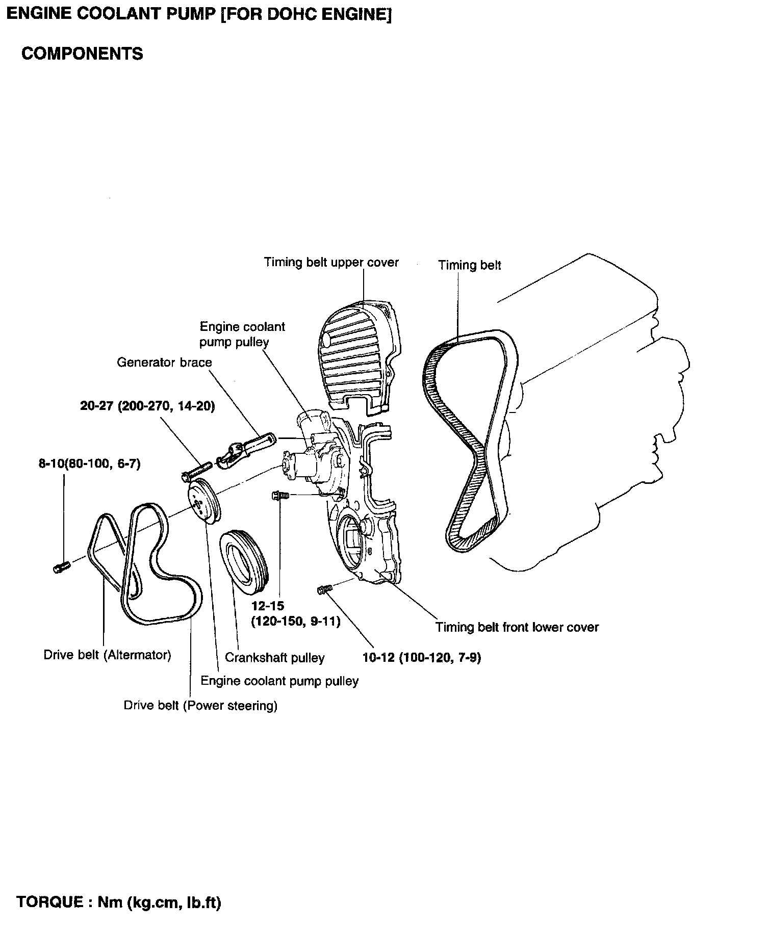Tightening torque - Engine coolant pump bolt: 20-27 Nm (200-270 kg.cm, 14-20 lb.ft)