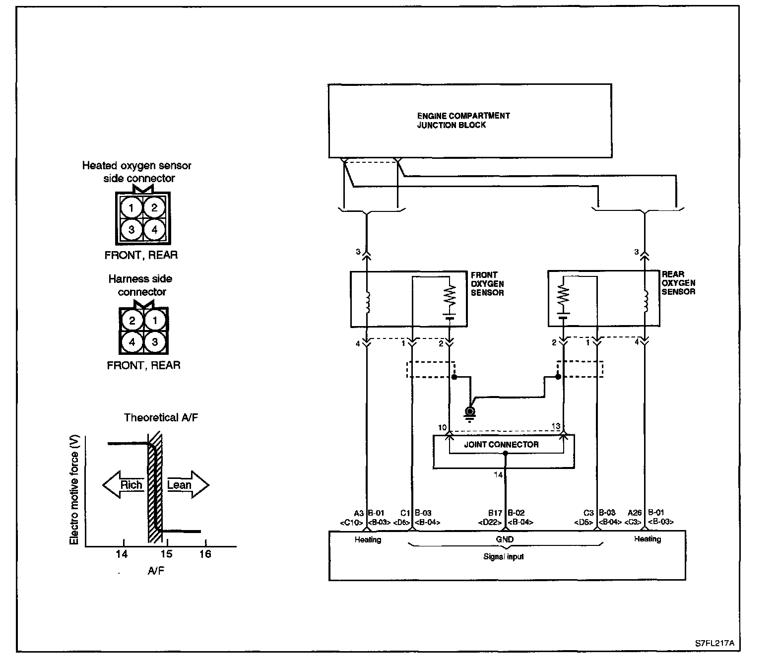 HEATED OXYGEN SENSOR (HO2S) [2.4 DOHC]The heated oxygen sensor senses the oxygen concentration in exhaust gas, converts it into a voltage, which is sent to the ECM. The oxygen sensor outputs about 1 When the airfuel ratio is richer than the theoretical ratio, and outputs about 0 V when the ratio is leaner (higher oxygen concentration in exhaust gas). The ECM controls the fuel injection ratio based on this signal so that the air fuel ratio is maintained at the theoretical ratio. The oxygen sensor has a heater element which ensures the sensor performance during all driving conditions.
