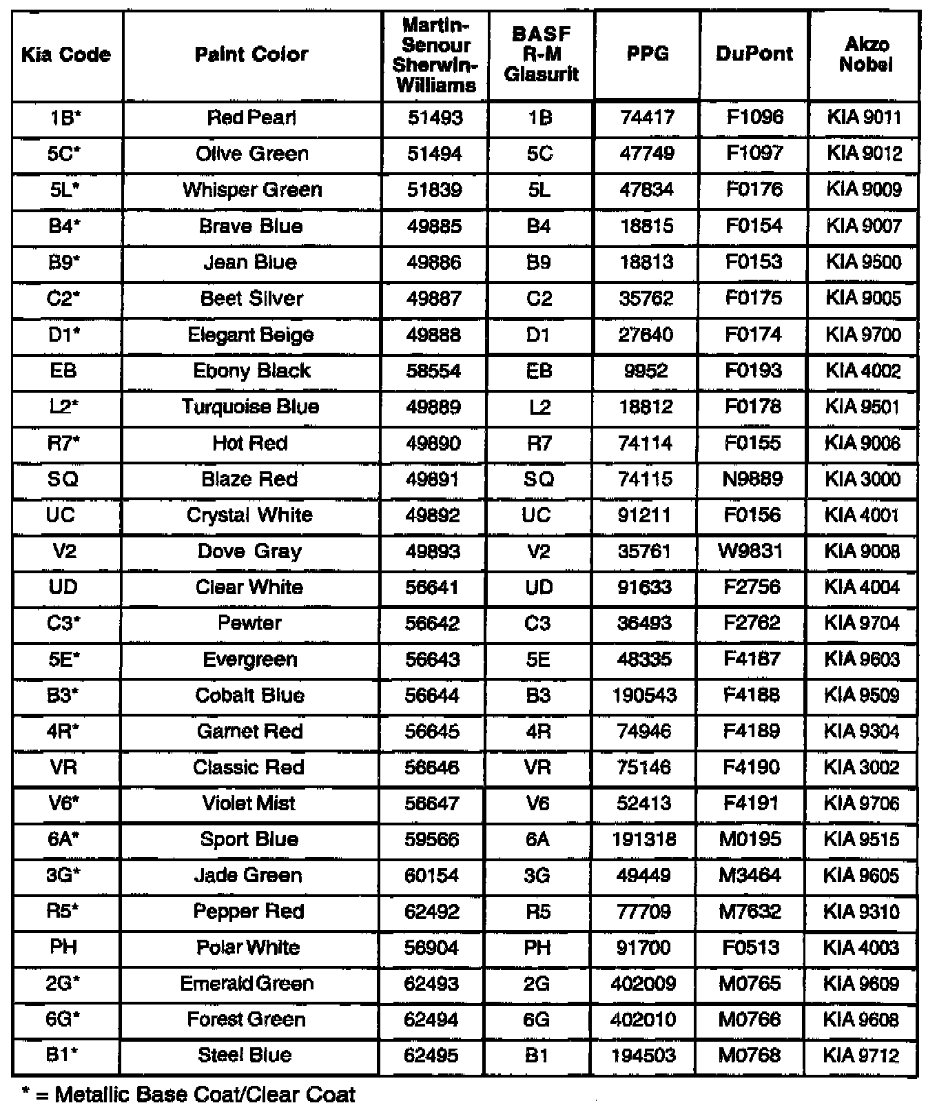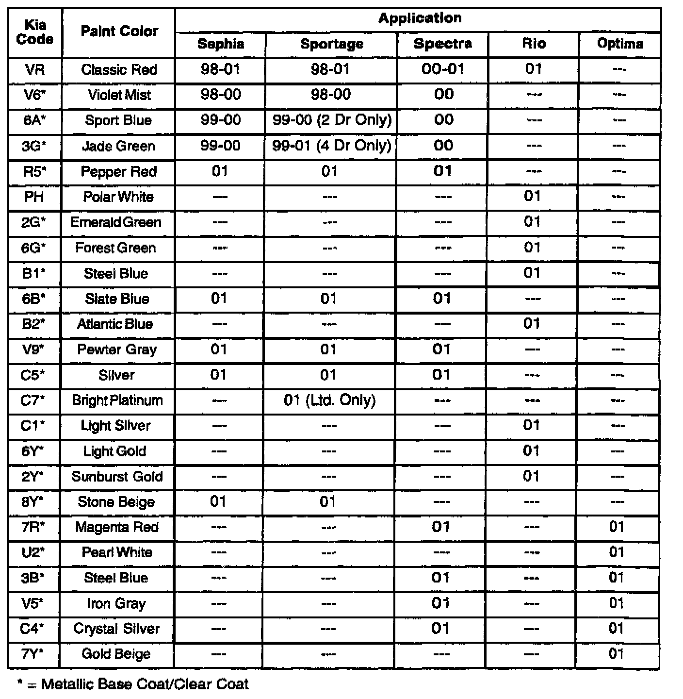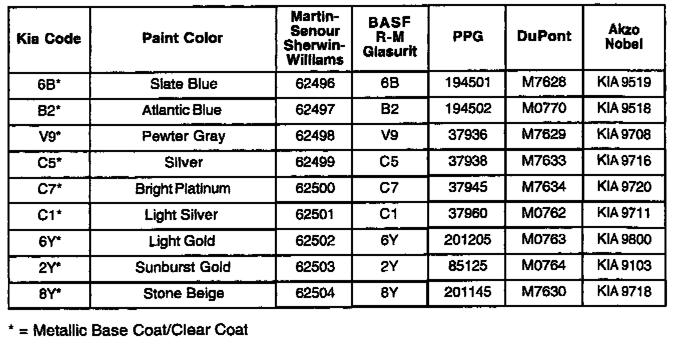 This bulletin provides Kia paint color code application information for 1993 through 2001 Kia models along with corresponding refinish codes for five (5) major U.S. paint manufacturers. Also included with this bulletin are the five paint manufacturer's Customer Assistance telephone numbers for technical/color formula information.