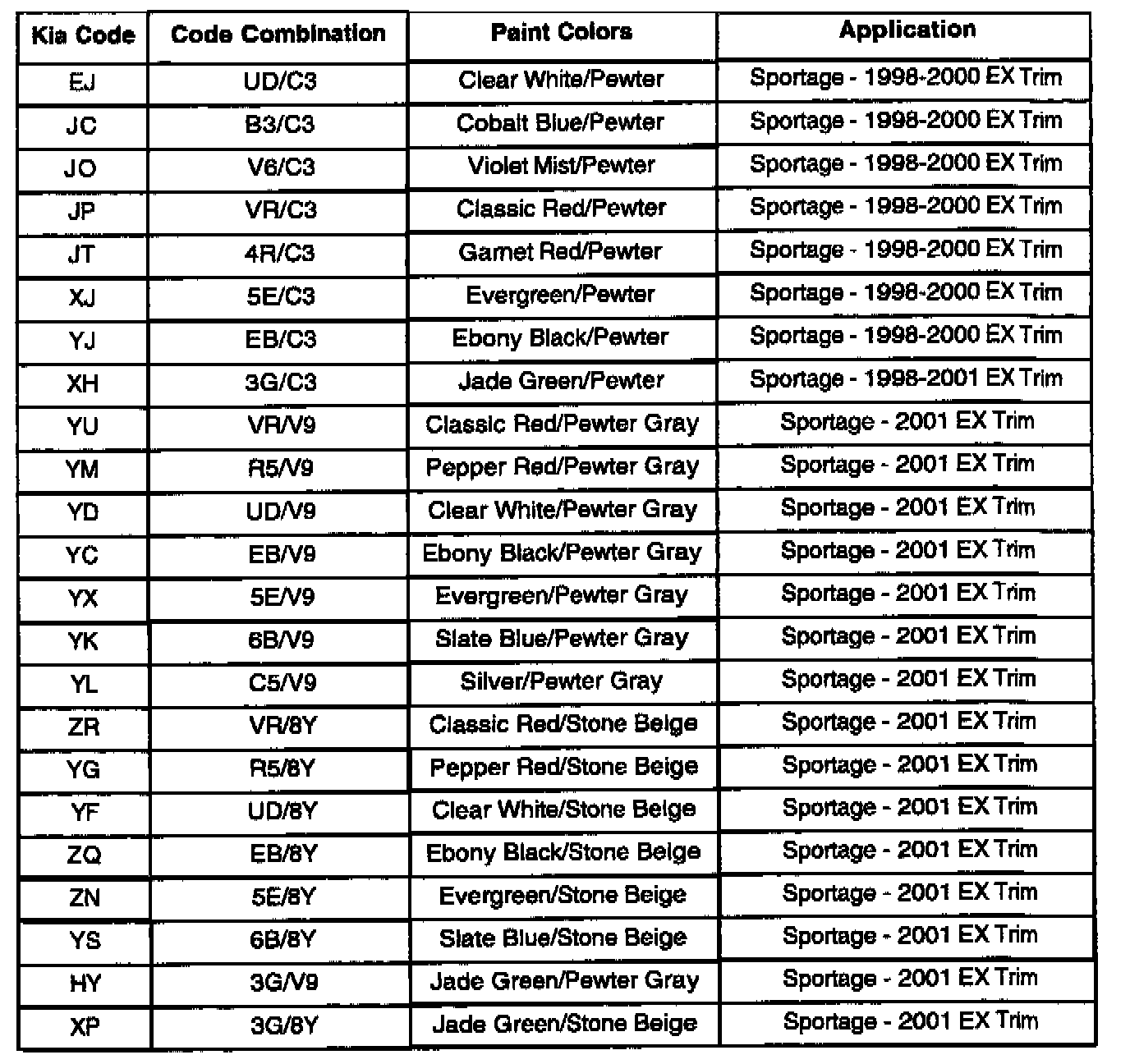 1998-2001 EX SPORTAGE TWO-TONE COLOR CODE INFORMATION