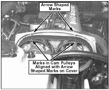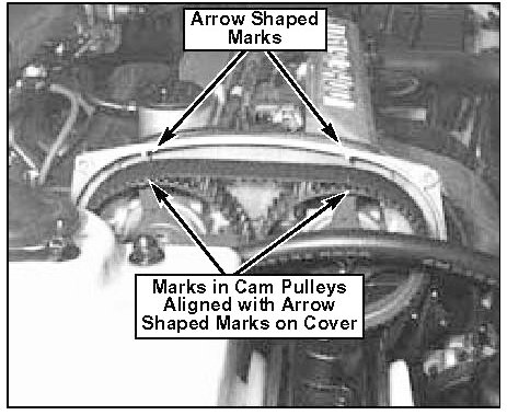 4. Check position of timing marks on intake and exhaust camshaft pulleys. The marks must line up with corresponding marks on rocker cover.