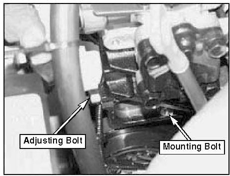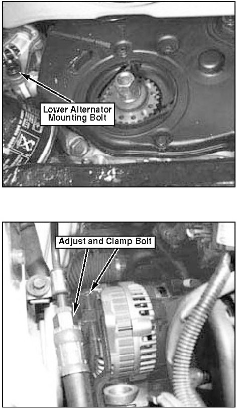 10. Loosen alternator mounting and tensioner bolts, and remove alternator/waterpump belt.