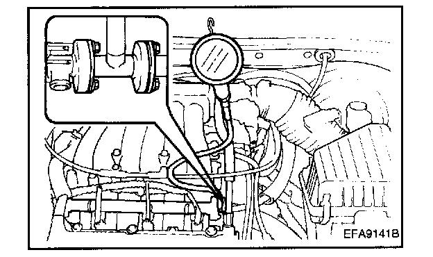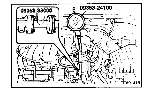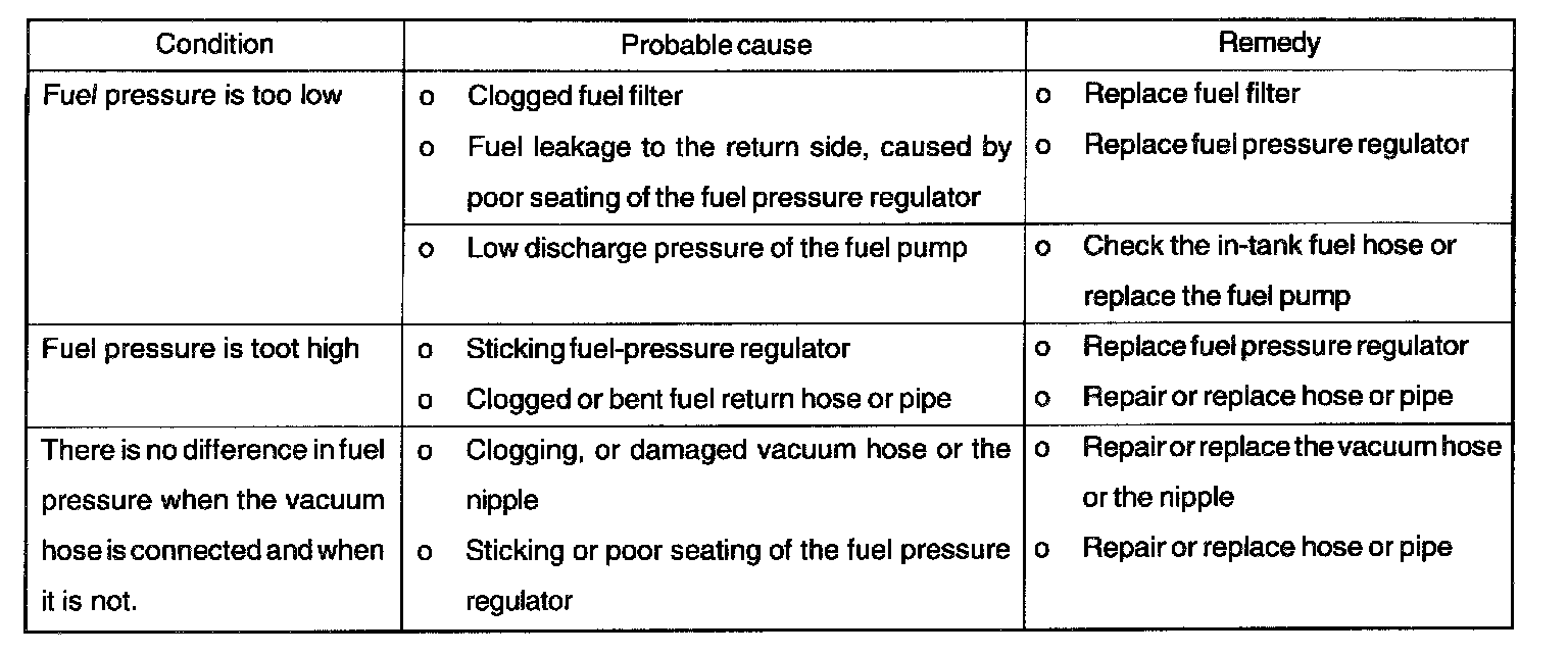 10. Stop the engine and check for a change in the fuel pressure gauge reading, which should hold for approximately 5 minutes. If the gauge indication drops, observe the rate of drop. Determine and remove the causes according to the following table.