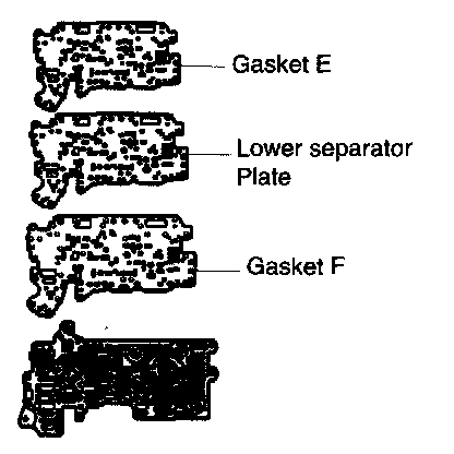 3. Set new gasket F, lower separator plate, and new gasket E onto lower valve body.