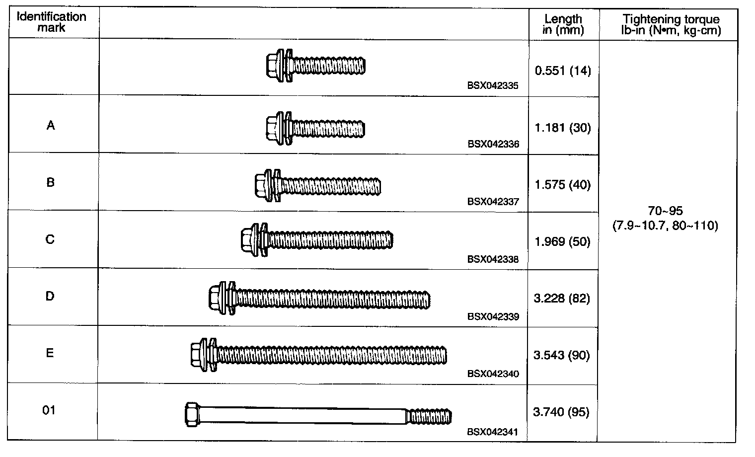 Tightening torque: 69.6 - 94.8 inch lbs. (7.9 - 10.7 Nm, 80 - 110 kg-cm)