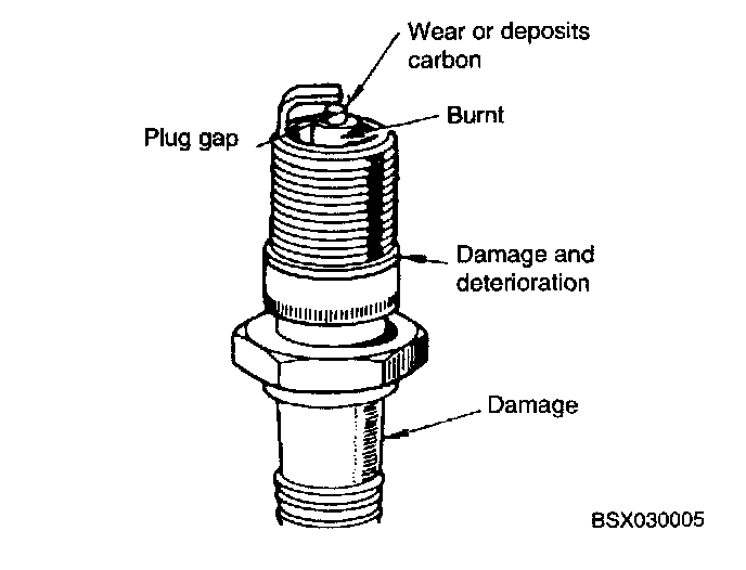 - Broken or burned ceramic insulator. If present replace plug.