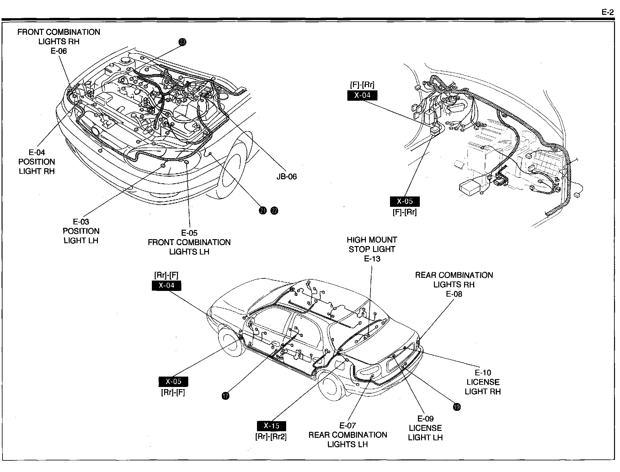 E-2 - Back-up Lights, License Lights, Tail Lights, Stop Lights, Position Lights, High Mount Stop Lights Harness/Connector Symbols:
