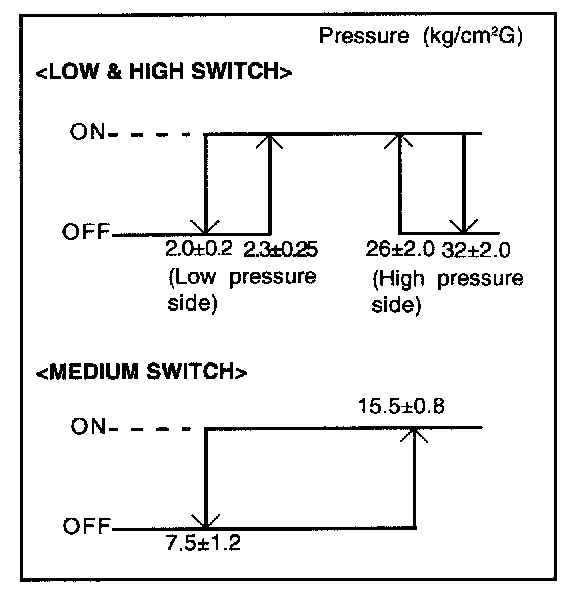 The triple pressure switch is a combination of the low pressure switch (for checking the quantity of refrigerant) and the high pressure switch (for prevention of overheating) and medium pressure switch (for operating cooling fan and condenser fan at high mode). It is installed in the receiver, and, when the pressure becomes approximately 200 kPa (29 psi) or lower, the compressor stops, thus preventing the compressor from being damaged by heat. When the pressure reaches 3,241 kPa (470 psi) or higher, the compressor stops, thus preventing overheating. There is generally no necessity for inspection; if, however, an unusual condition, such as non operation of the compressor is encountered, check by following the procedures below.