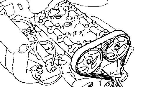 23. Turn the exhaust camshaft sprocket one tooth clockwise to align its timing mark with the cylinder head top surface. Then, pulling the belt with both hands, install it around the exhaust camshaft sprocket.