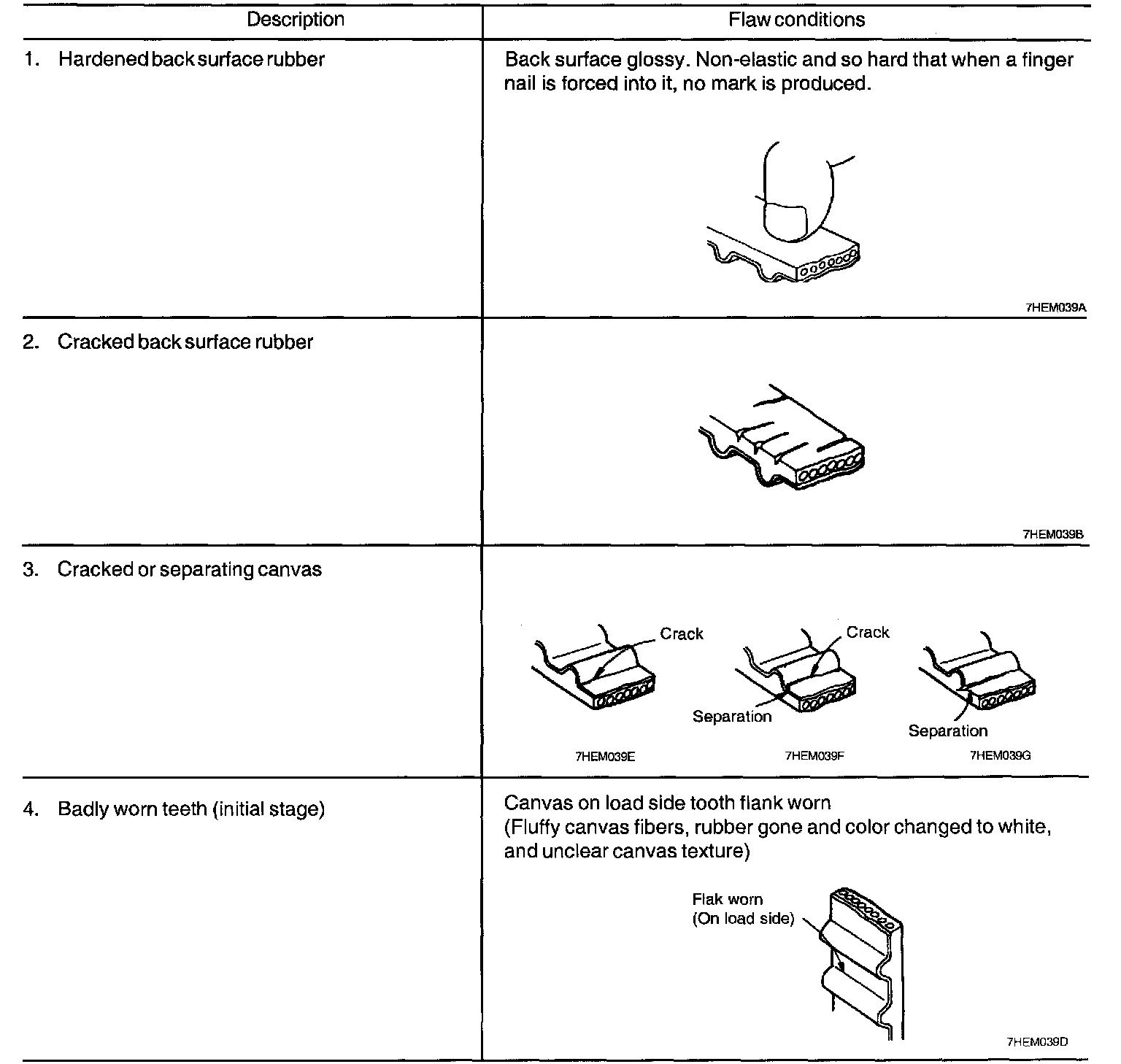 2. When the engine is overhauled or belt tension adjusted, check the belt in detail. If the flaws are evident, replace the belt with a new one.