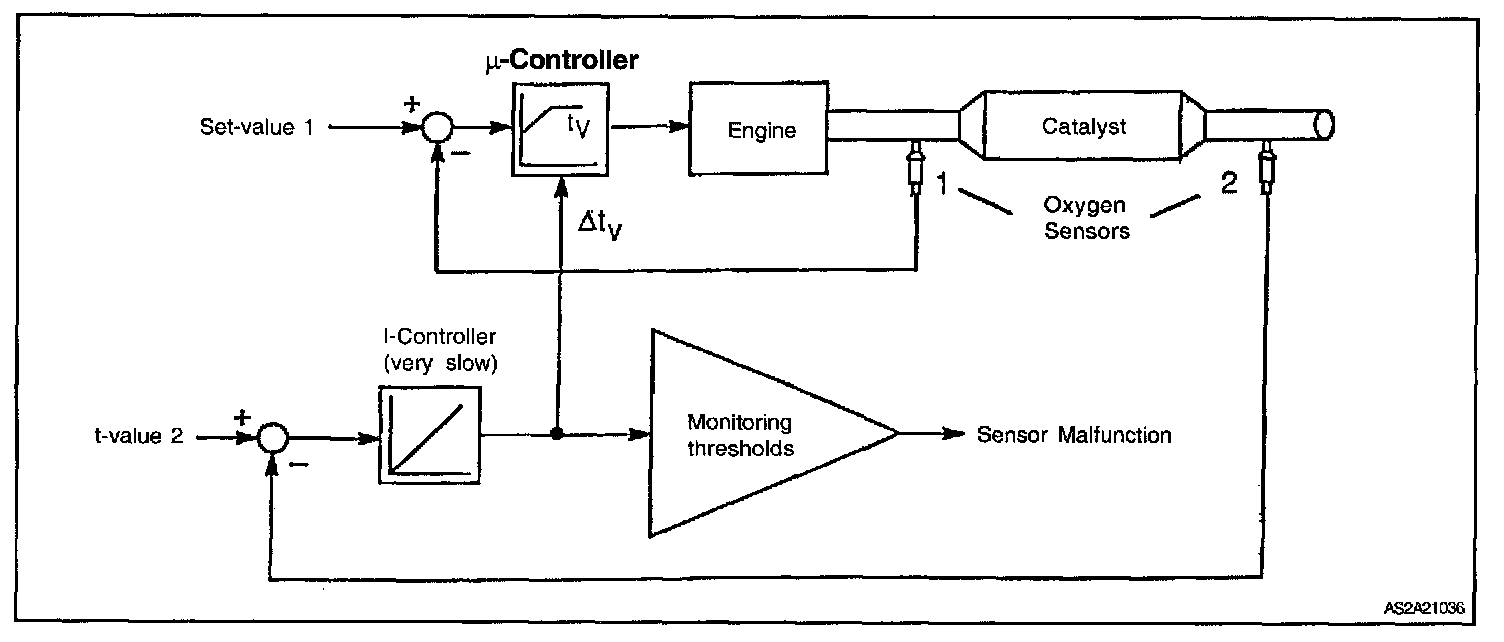 The sensor aging is monitored by comparing the front and rear HO2S and also using the correction value (Tv) which determines the mean value of the lean/rich shift necessary for optimal air/fuel ratio-control. With the help of this information, the ECM can make allowance for aging of the front HO2S in its injection period calculations. When the parameter-Tv is above or below the specific limits, the ECM will set the diagnostic trouble code HO2S Slow Response by aging.