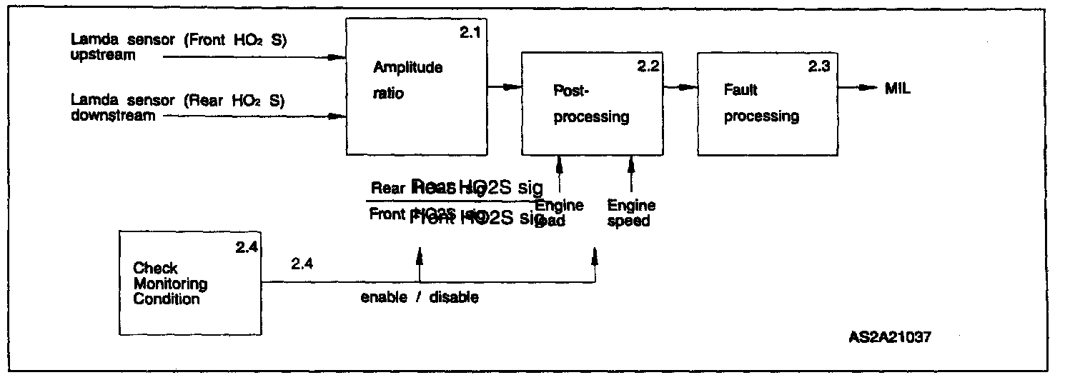 To monitor the system, the lean-to-rich switches of front to rear HO2 Sensors is counted. The ratio of rear switches to front switches is used to determine whether the catalyst is operating properly. An effective catalyst will have fewer rear switches than it has front switches, that is, a ratio closer to zero. For a totally ineffective catalyst, this ratio will be one-to-one indicating that no oxidation occurs in the catalytic converter.