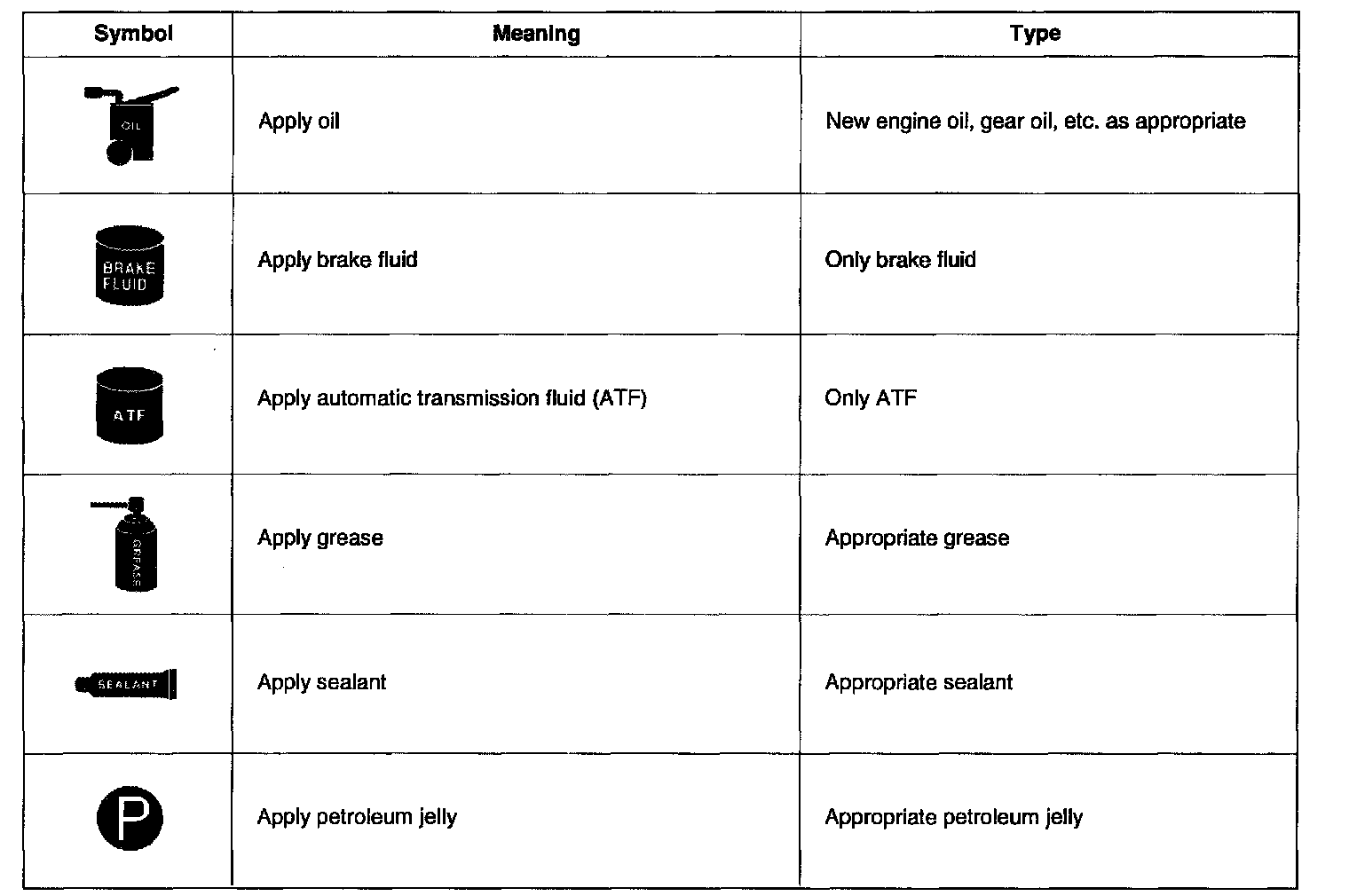 There are six primary symbols used to complement illustrations. These symbols indicate the areas to apply such materials during service.