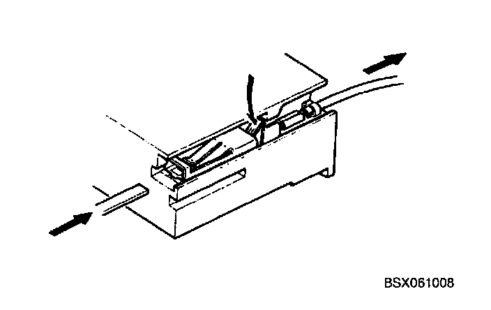 Insert a thin piece of metal from the terminal side of the connector, and then, with the terminal locking tab pressed down, pull the terminal out of the connector.