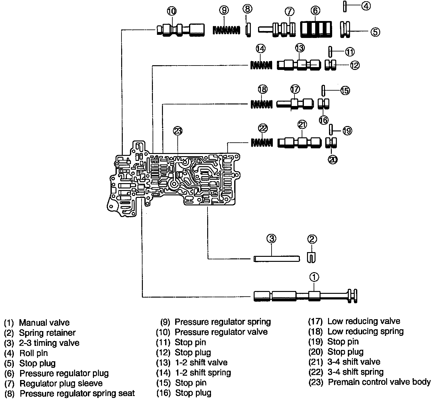 3. Insert 1-2 shift spring, 1-2 shift valve, and stop plug. Secure them with stop pin.