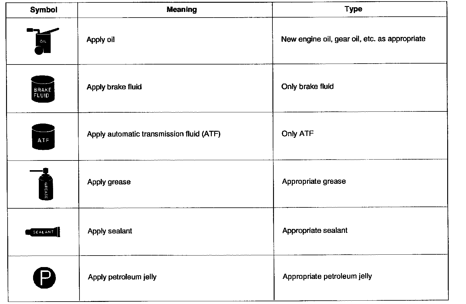 There are six primary symbols used to complement illustrations. These symbols indicate the areas to apply such materials during service.