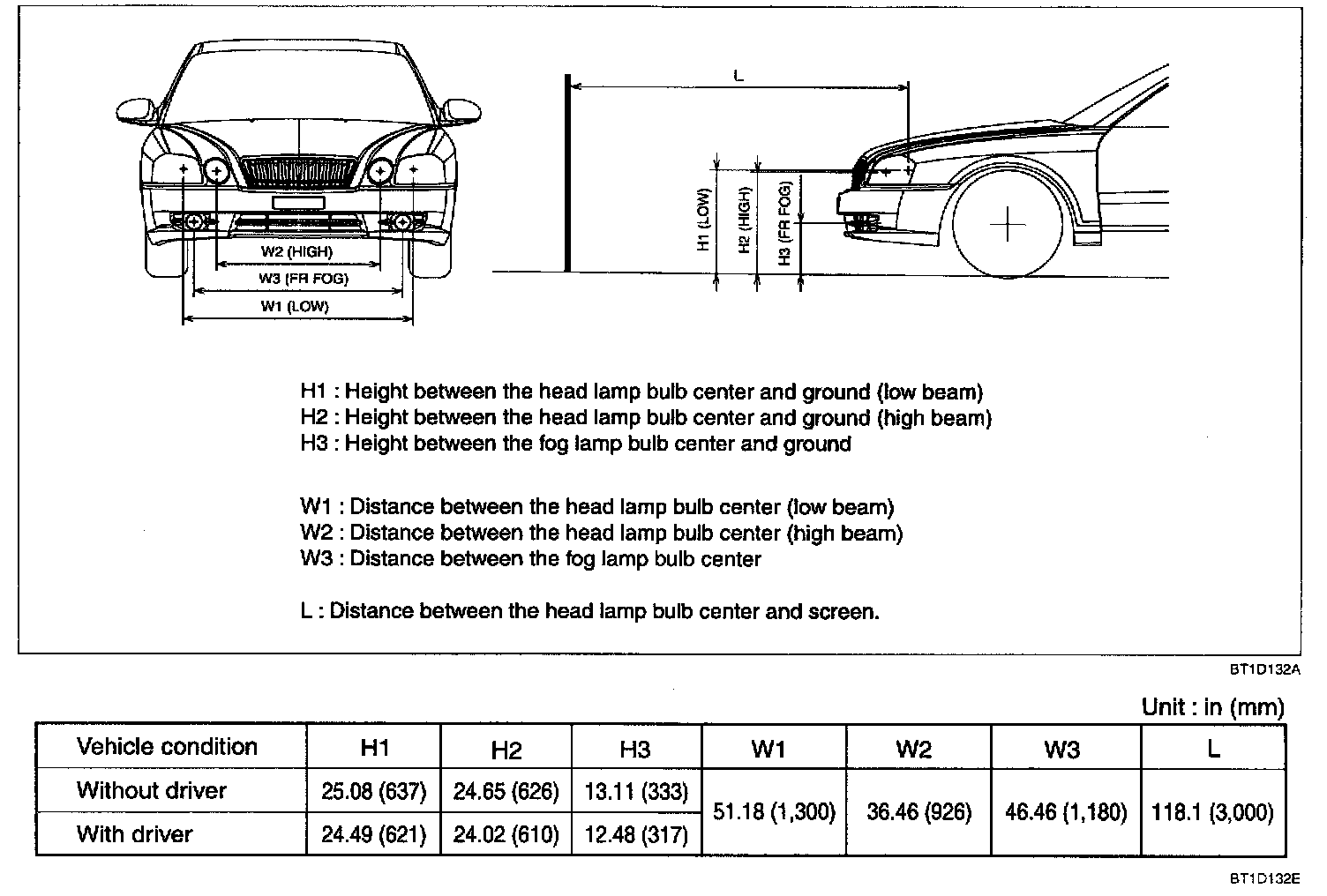 3. Turn the front fog lamp on without the driver aboard. The cut-off line should be projected in the allowable range (shaded region).
