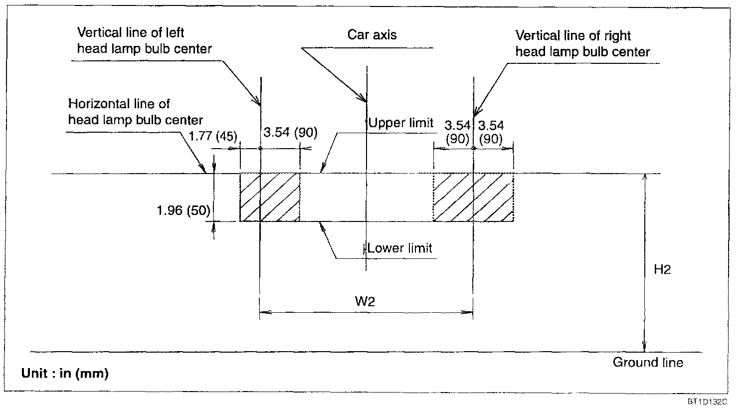 2. Turn the high beam on without the driver aboard. The cut-off line should be projected in the allowable range (shaded region).
