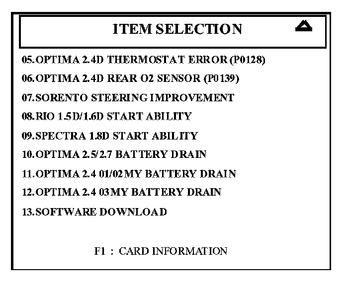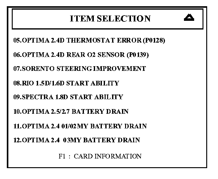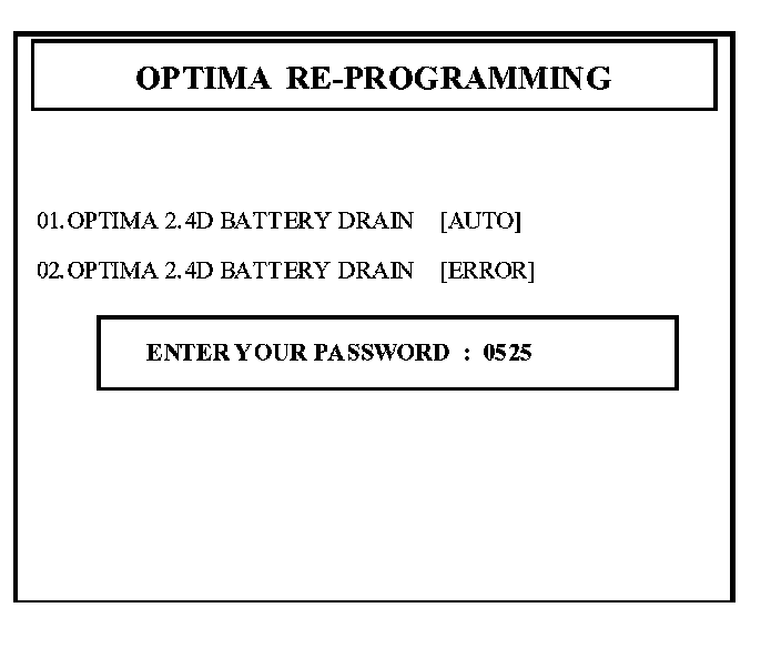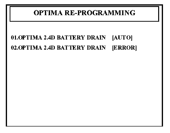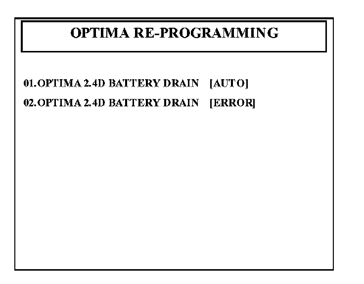 16. Select "02. OPTIMA 2.4D BATTERY DRAIN [ERROR]" and press the "ENTER" key.