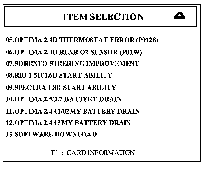 15. Turn Hi-Scan Pro on and select "11. OPTIMA 2.4 01/02MY BATTERY DRAIN" and press the "ENTER" key.