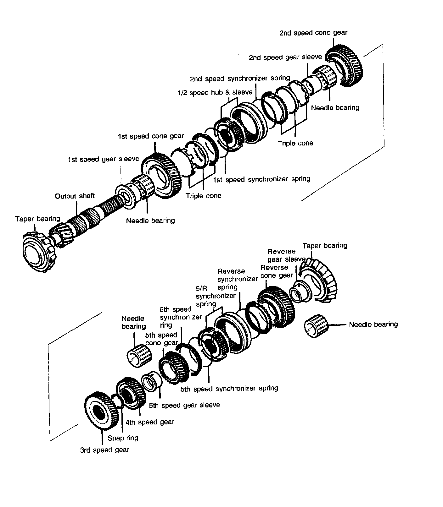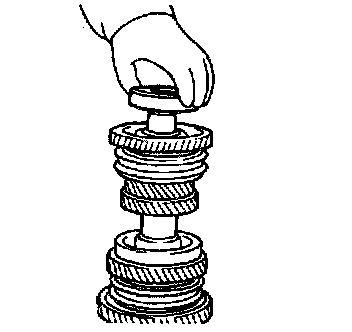 9. Install the 4th speed gear, the 5th speed gear sleeve, the needle roller bearing, the 5th speed gear, the synchronizer ring (5th), the synchronizer hub and the sleeve (5 & R).