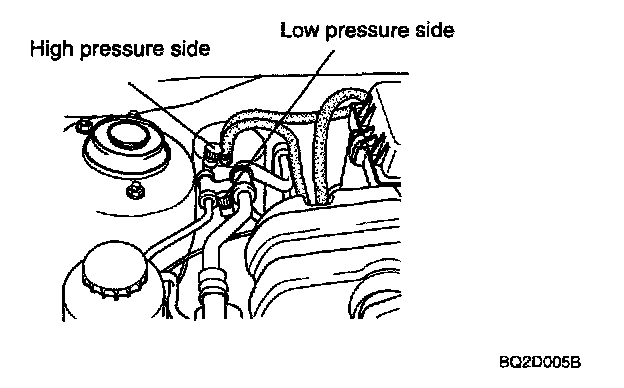 Connect a R-134a refrigerant Recovery/Recycling/Charging System to the high-pressure service port and the low-pressure service port, as shown, following the equipment manufacturer's instructions.