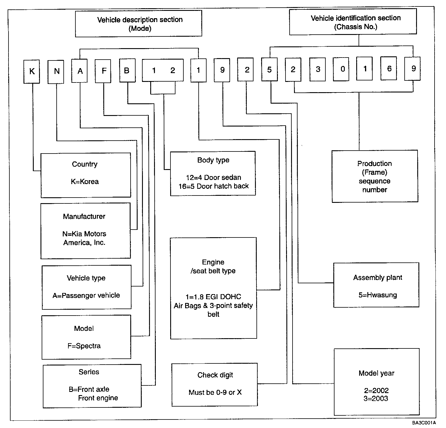 The vehicle identification number (VIN) for the Kia Spectra is a 17-digit stamped on a metal plate that is located on the driver's side of the instrument panel visible from outside of the vehicle through the windshield. The VIN is also stamped into the passenger side of the engine compartment bulkhead. The VIN is composed of the following codes: