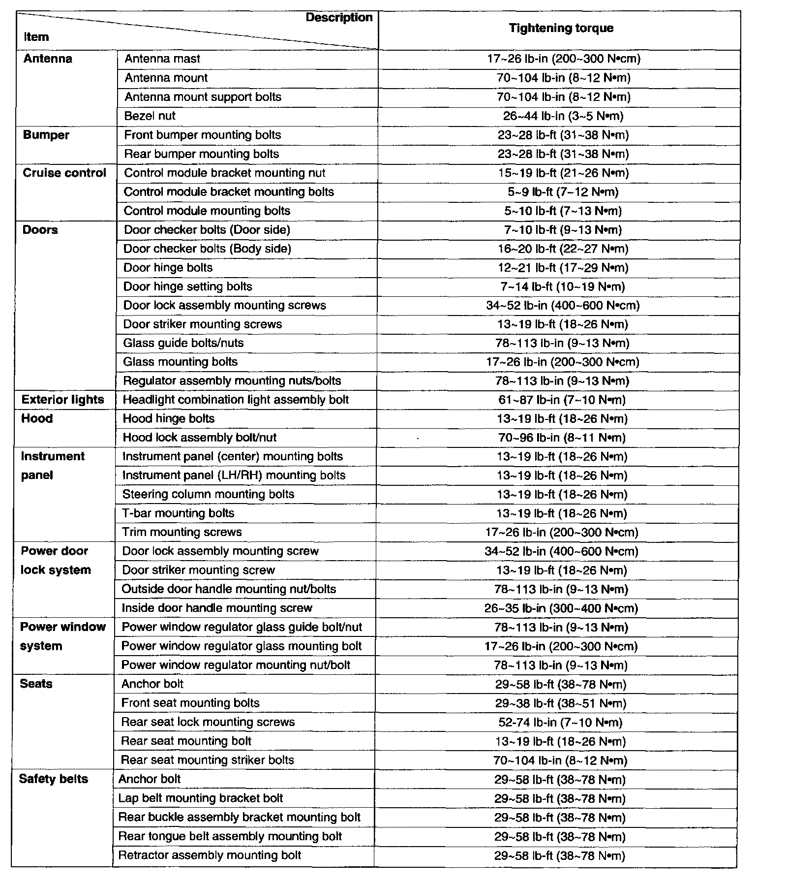Tightening Specifications: