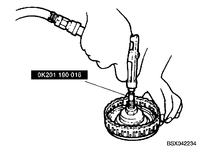 1. Install SST (OK201 190 016) as shown, and check clutch operation by applying compressed air.