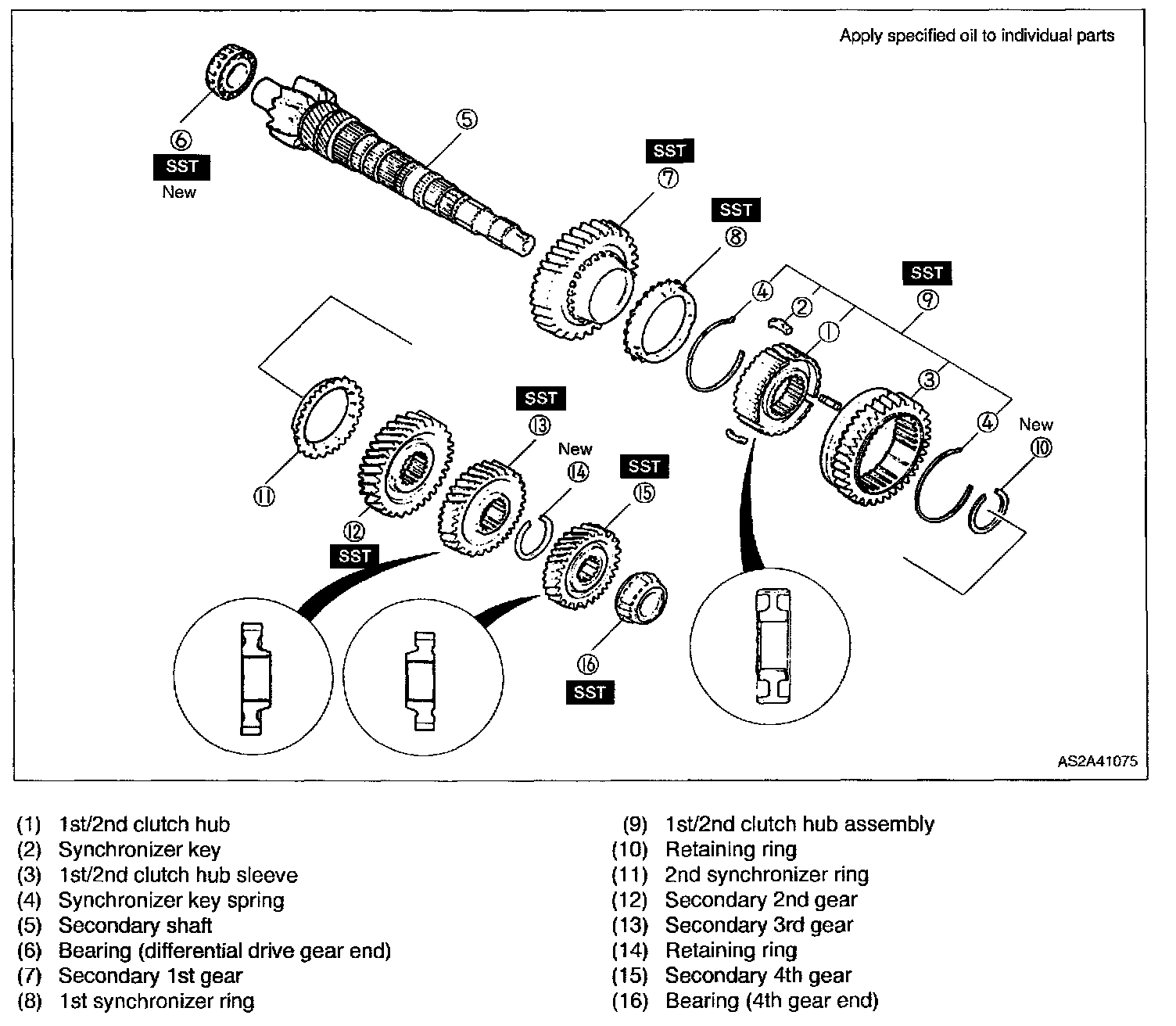 1. Assemble secondary 1st gear, 1st synchronizer ring, and 1st/2nd clutch hub assembly as shown in figure.