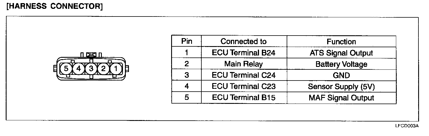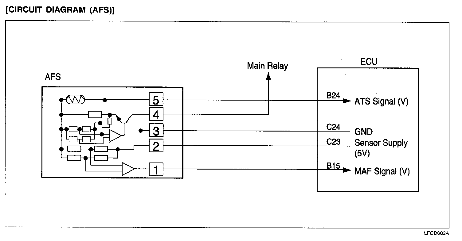 AIR FLOW SENSOR (AFS): MASS AIR FLOW (MAF) SENSOR & INTAKE AIR TEMPERATURE SENSOR (ATS)This hot film type Air Flow Sensor (AFS) is composed of a hot film sensor, housing and metering duct (hybrid sensor element). Mass air flow rate is measured because the change of the mass air flow rate causes a change in the amount of heat being transferred from the hot film probe surface to the air flow The air flow sensor generates a pulse so it repeatedly opens and closes between the 5 V voltage supplied from the ECU.