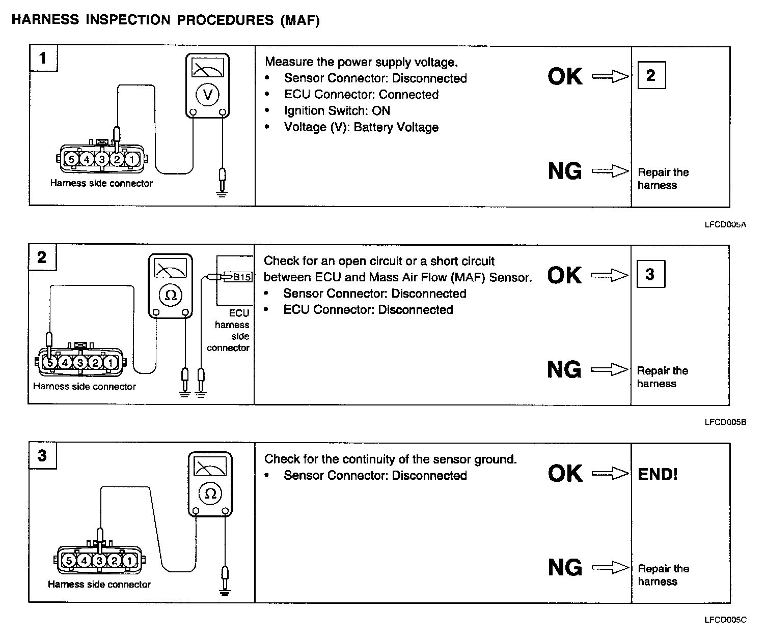 1. If the engine stalls occasionally, start the engine and shake the MAF sensor harness. If the engine stalls, check for poor contact at the MAF sensor connector.